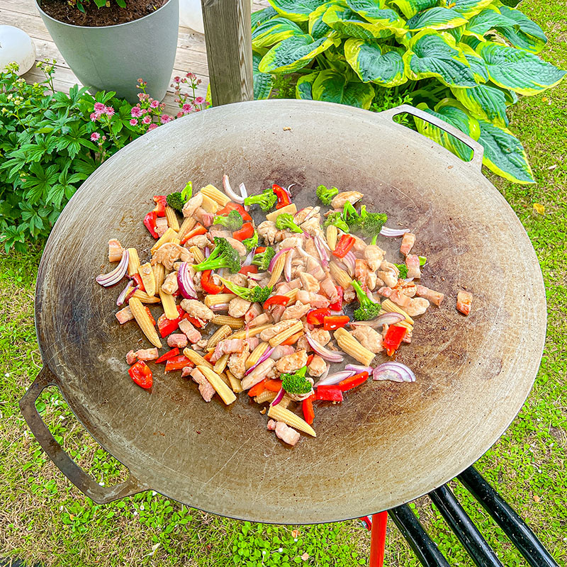 Færdigstegt kyllingwok på Timsfors Stegehætte 70 cm.