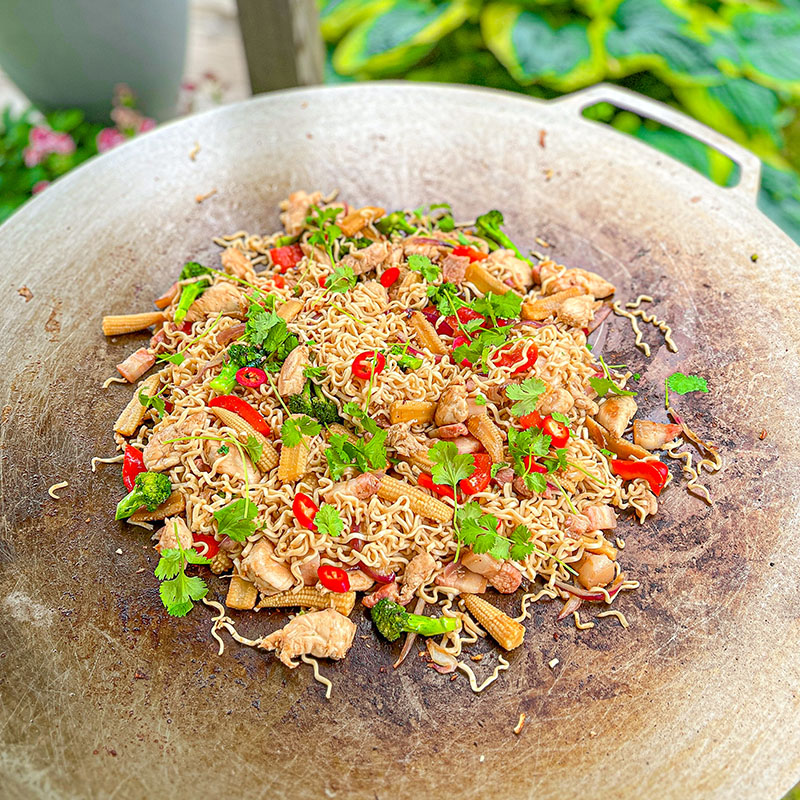Laver kyllingwok med nudler og grøntsager på Timsfors Stegehætte 70 cm.