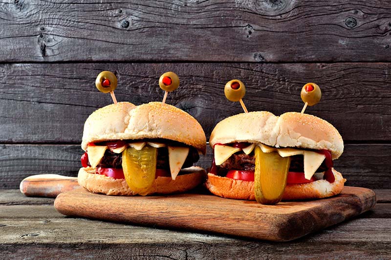For at omdanne burgerne til små søde monstre, sæt tandstik med oliven som øjne, brug et stykke syltet agurk som tunge og lav hugtænder af osteskiver. Top med ketchup som blod.