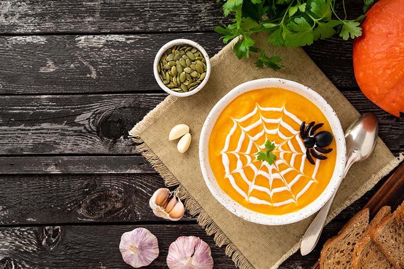 Pisk fløde eller kokosfløde og hæld det i en dressingsflaske eller en sprøjtepose. Sprøjt suppen med fløden i form af et edderkoppespind (et tip er at bruge en tandstik til at lave de små streger). Dekorér med nogle edderkopper lavet af sorte oliven. Mums!