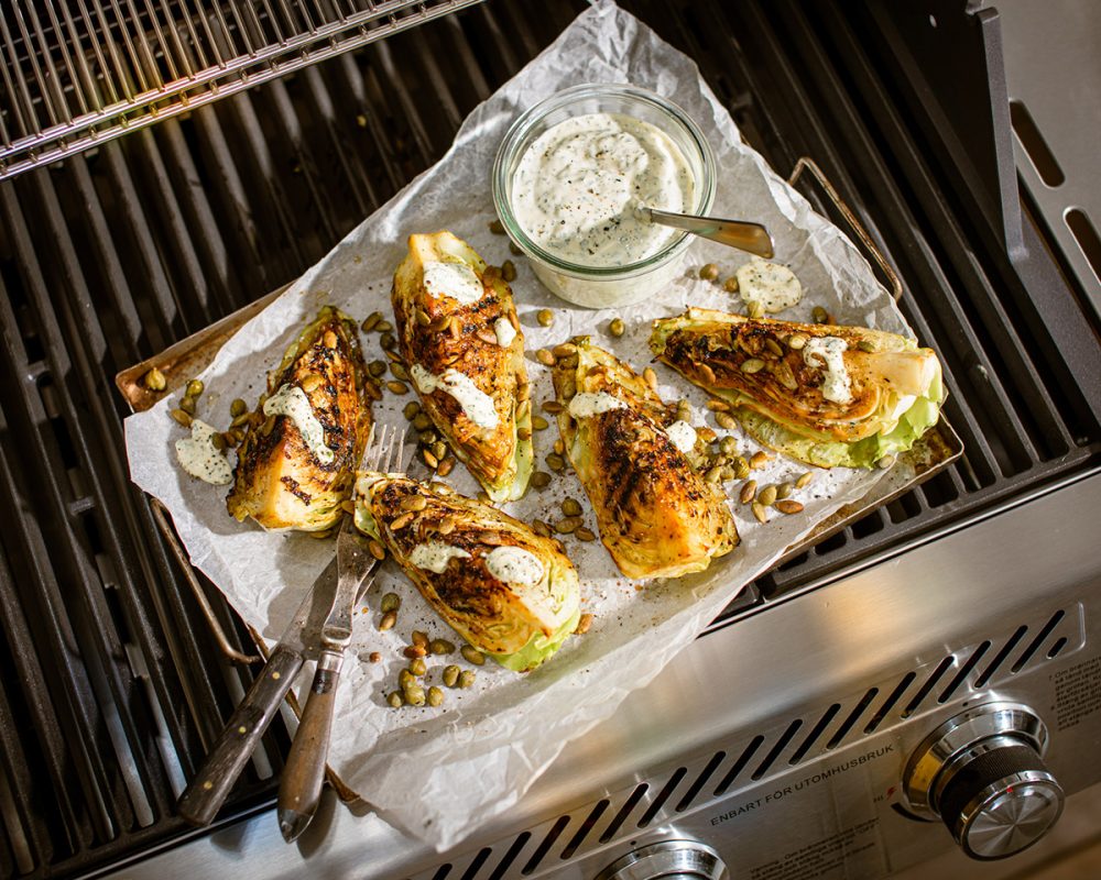 Opskrift – Grillet spidskål med urte-mayonnaise, kapers og ristede græskarkerner