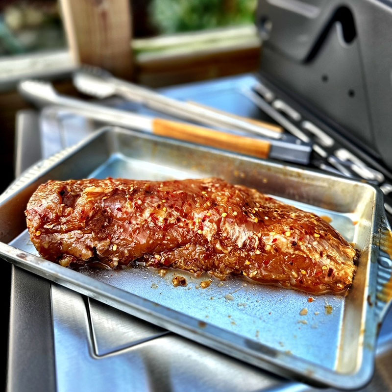 Honningmarineret flæskytterfilet venter på at blive grillet.