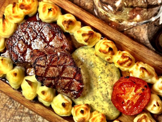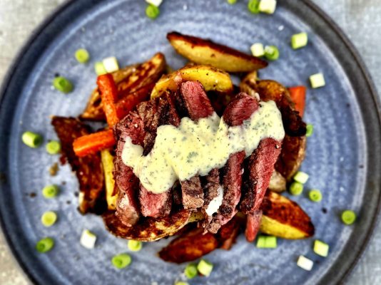 Skær kødet op og læg kartoflerne på tallerkenen. Server med bearnaisesauce og grillet tomat.