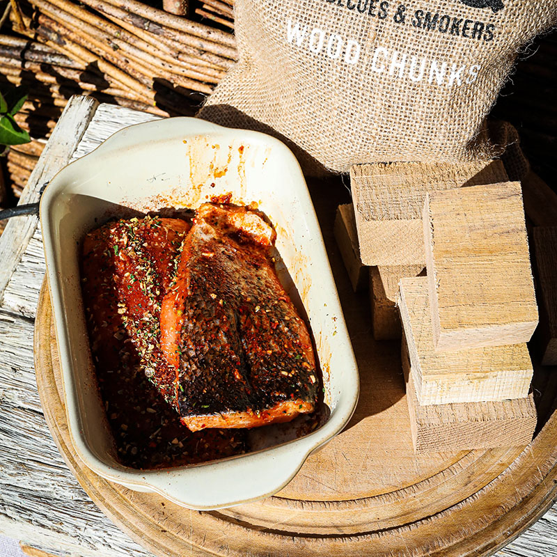 - Forvarm din smoker til 150-180˚C og tilsæt 2-3 stykker røgflis (vi anbefaler egetræssmag). Hvis du ikke har en smoker, lav en zone for indirekte varme og en zone for direkte varme på din grill (brug den indirekte varmesone til maden). Placer en røgboks med røgflis på grillen for at skabe røgsmag.