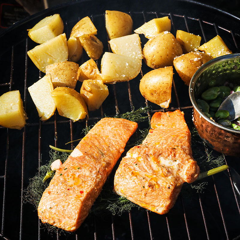 Griller laksfileter, nye kartofler og bondbønner på ProQ BBQ Smoker.