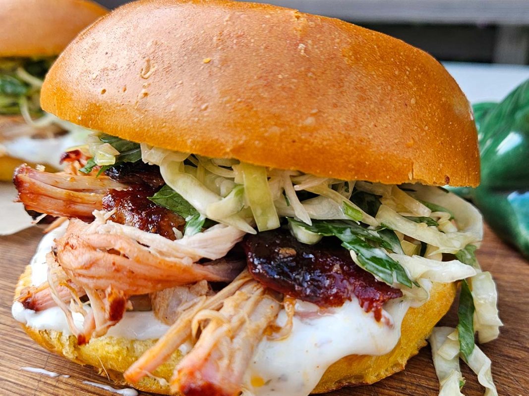 Snak om en smagsbombe i en sandwich! Denne episke sandwich kombinerer røget flæsk, der smelter i munden, med cremet hvidløgssauce, syltede grøntsager og sprød coleslaw. Alt sammen serveret på lækkert briochebrød.