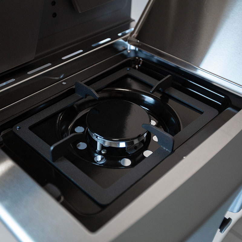 Kogezonen, som er integreret i det andet sidobord, er ideel til at forberede tilbehør som saucer, grøntsager og andre sideretter. Placér en gryde eller stegepande på zonen for at koge, stege eller sautere ingredienser, mens du laver hovedretten på den normale grillflade.