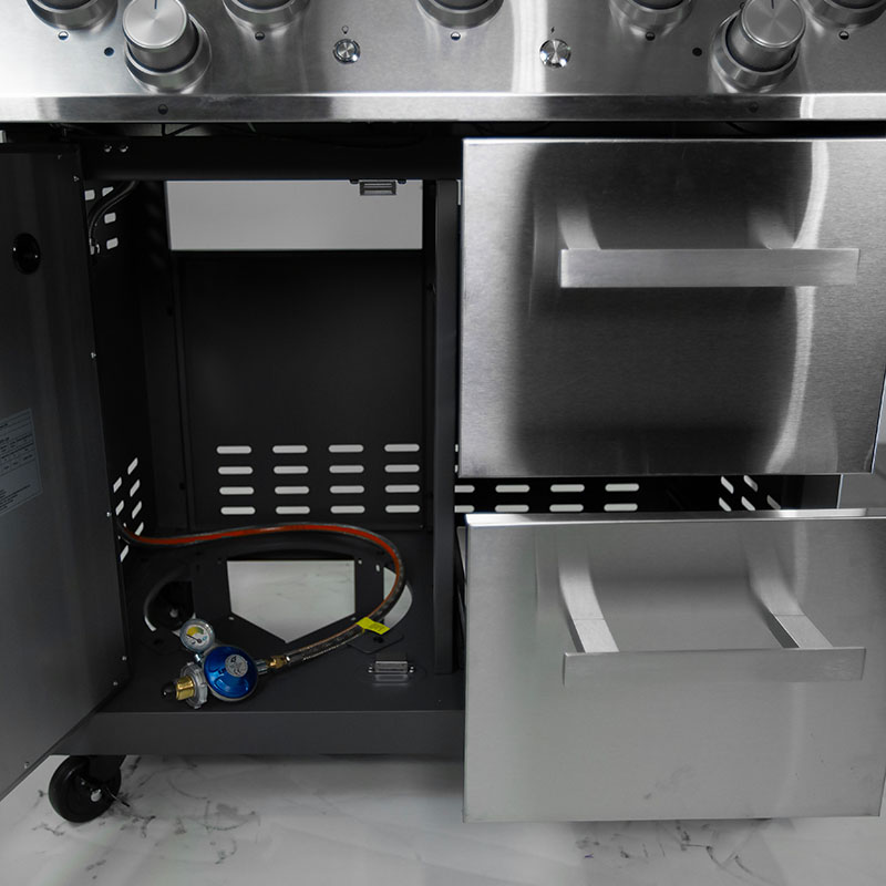 X502 tilbyder fremragende opbevaringsmuligheder. De to sidoborde giver masser af plads til madforberedelse og servering, mens skabet er perfekt til at opbevare gasflasken. De to udtrækkelige skuffer gør det nemt at holde styr på dine grilltilbehør, og de seks kroge giver en praktisk løsning til de redskaber, du vil have tæt på. Med fire hjul er grillen også nem at flytte, hvis det er nødvendigt.