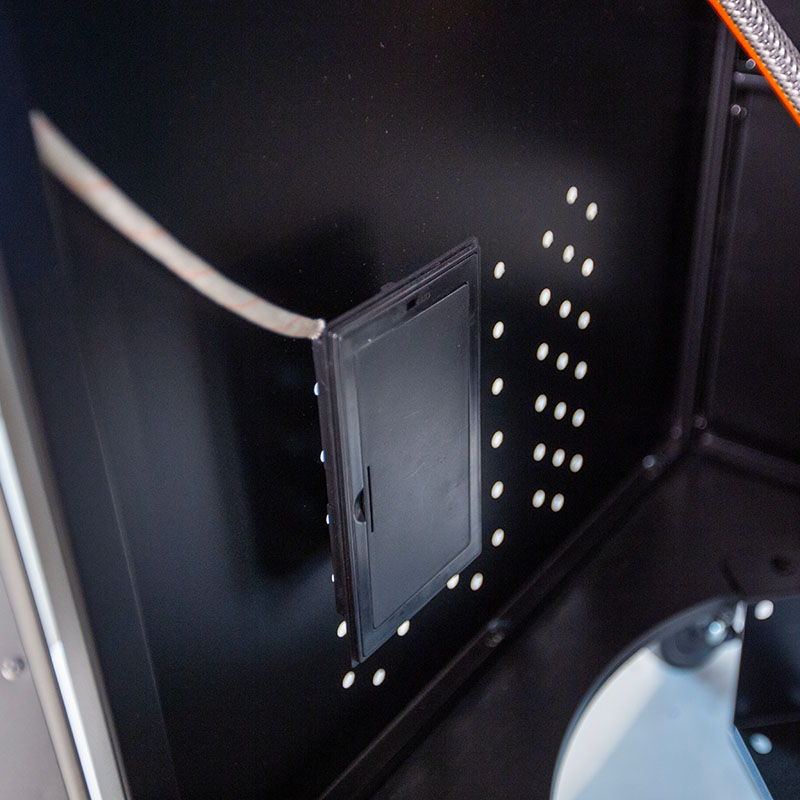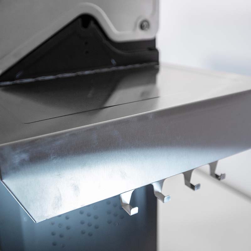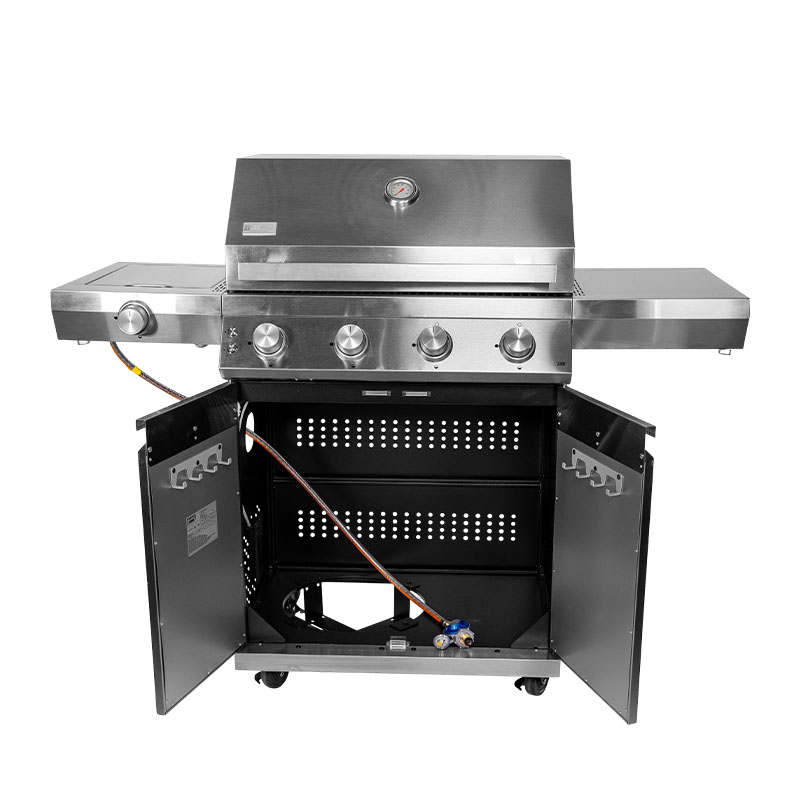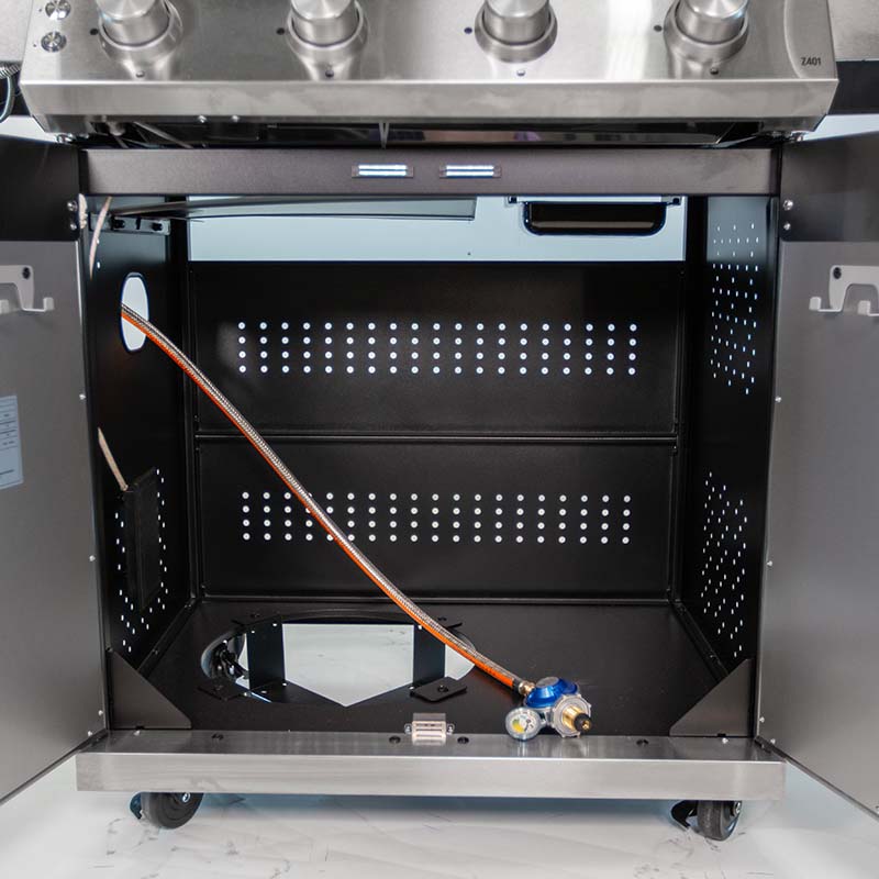 Grillen leveres med to funktionelle sidoborde, der er perfekte til både madforberedelse og servering. Z401 har også et praktisk opbevaringsskab, der kan rumme både gasflaske og grilltilbehør. Desuden er grillen udstyret med otte redskabskroge på siderne og yderligere fire kroge på indersiden af hver skabsdør. Vreden har indbygget LED-belysning, hvilket gør det nemt at overvåge grillens status, selv når det er mørkt udenfor. De fire hjul gør det muligt at flytte grillen nemt, når det er nødvendigt.