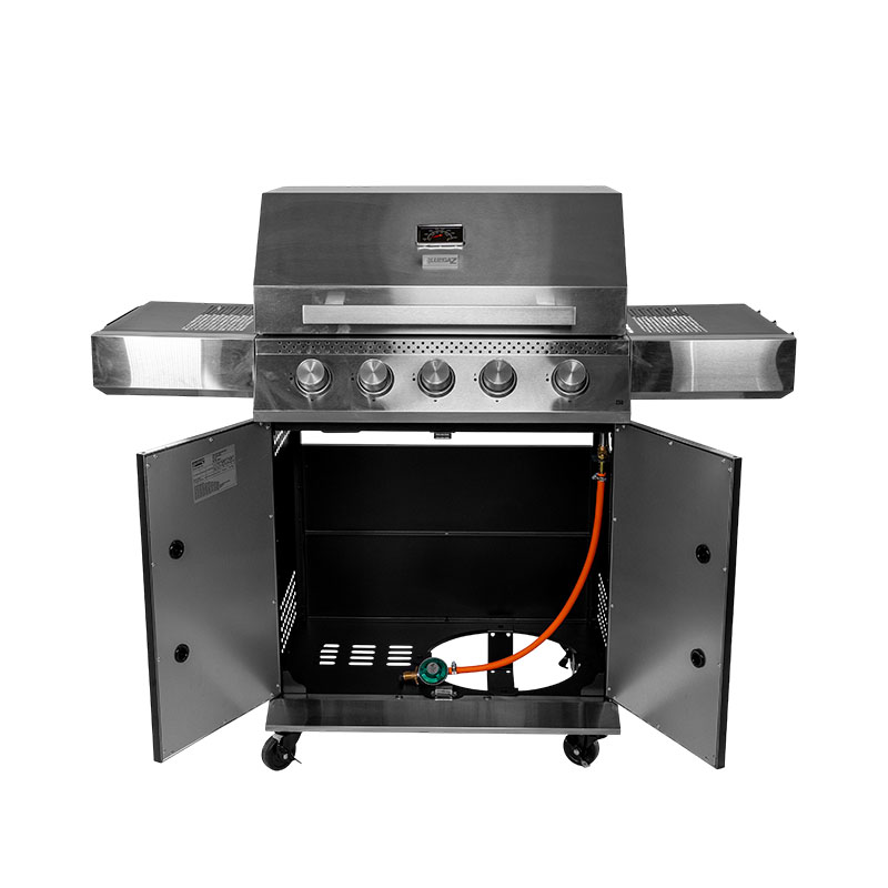 Z50 tilbyder to praktiske sidoborde, der giver masser af plads til både forberedelse og servering. Under grillen er der et smart opbevaringsrum til gasflasken og tilbehør. En af siderne er udstyret med en knivholder, mens den anden side har tre kroge til grillværktøjer. For ekstra bekvemmelighed har grillen fire hjul, der gør det nemt at flytte den efter behov.