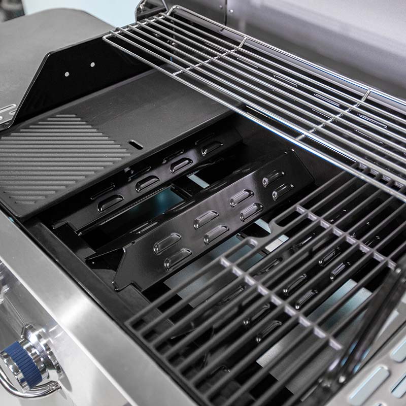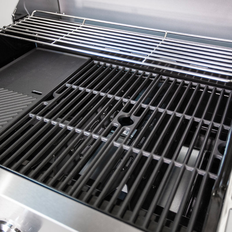 Med en rummelig grillyta på 61 x 44 cm kan du nemt tilberede mad til store selskaber. Z6 er udstyret med to robuste grillgaller i støbejern, et materiale kendt for sin varmeopbevaringsevne, jævn varmefordeling og lange holdbarhed. En tredjedel af grillytan er desuden blevet erstattet med en stegeplade i støbejern, hvilket åbner op for mange forskellige madlavningsmuligheder. På stegepladen kan du tilberede alt fra saftige burgere og sprød bacon til grøntsager, skaldyr eller pandekager direkte på grillen. Den medfølgende varmehylde sikrer, at maden forbliver varm, indtil det er tid til servering.