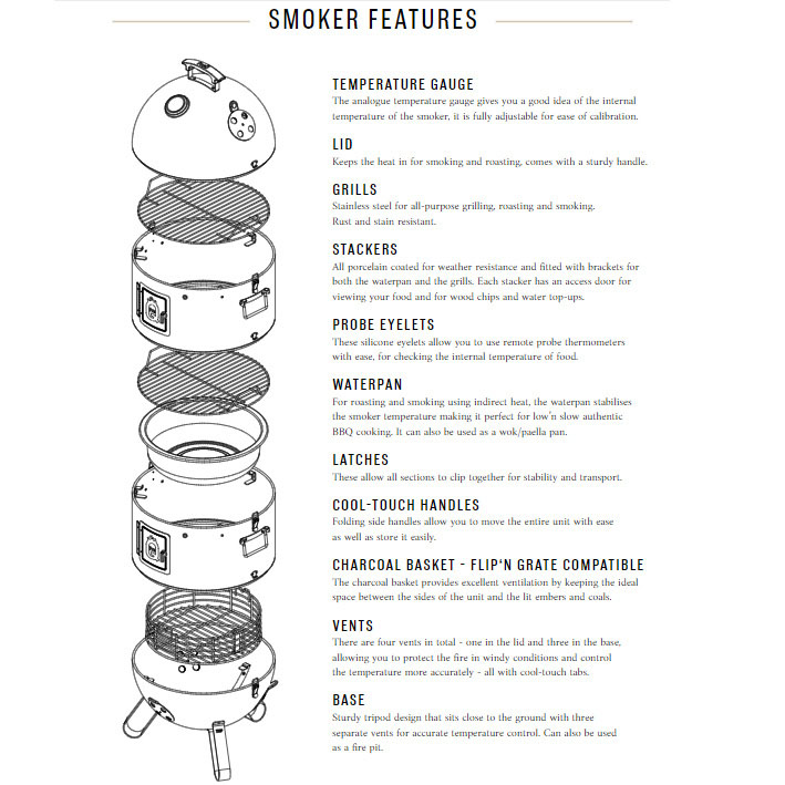 Røggrillen har i alt fire ventiler (én i låget og tre i bunden), så du nemt kan styre temperaturen og beskytte varmen under blæsende forhold. Der er også et indbygget termometer i låget samt udtag til grilltermometersonder på hver enhed, så du kan overvåge kernetemperaturen i maden.