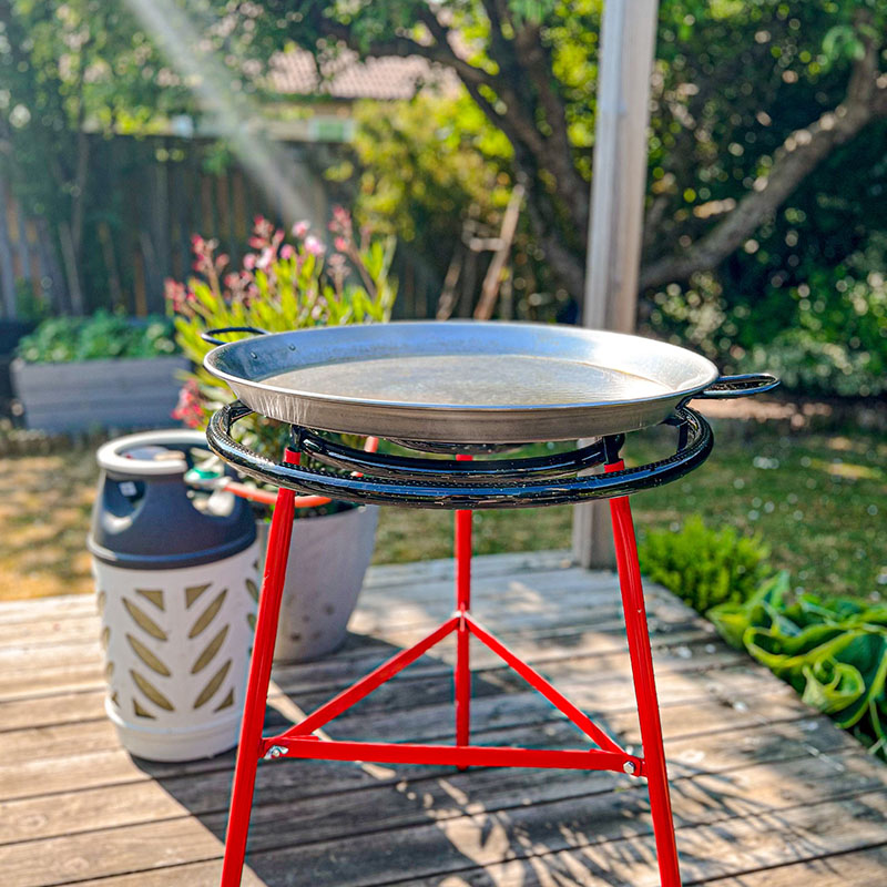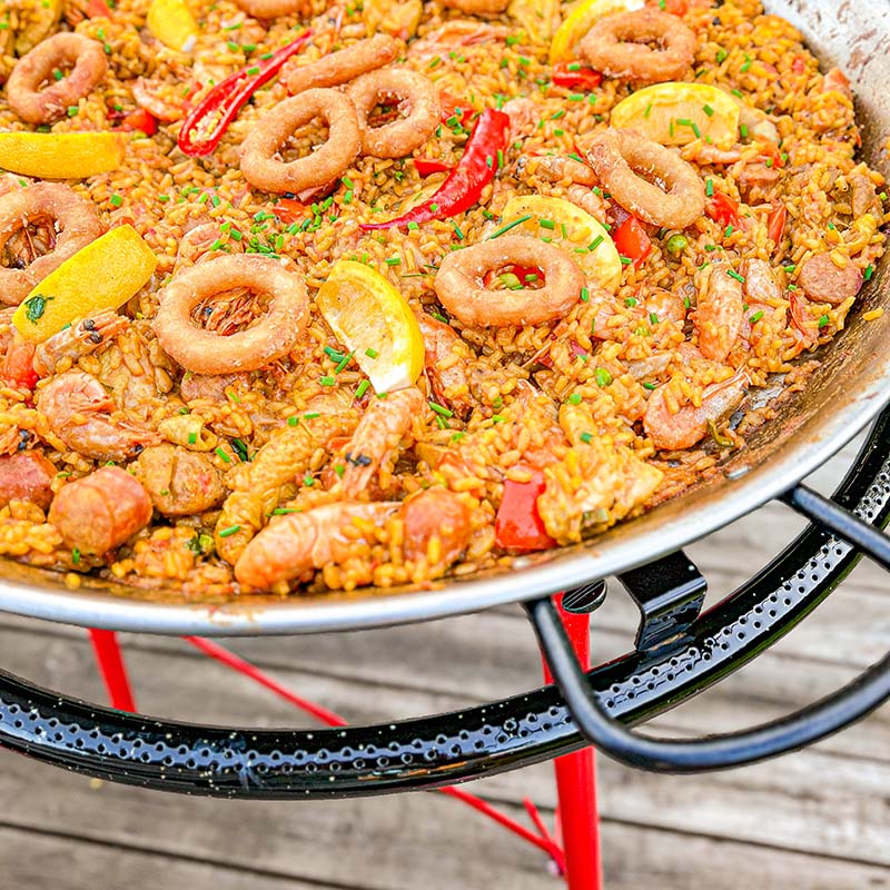 Få fat i dette store paella-pakke og bliv paella-mester på ingen tid! Dette komplette paella-pakke inkluderer en paellapande i poleret stål, en gasbrænder med tre ringe, et stativ, en paellaske og et gasregulatorsæt.