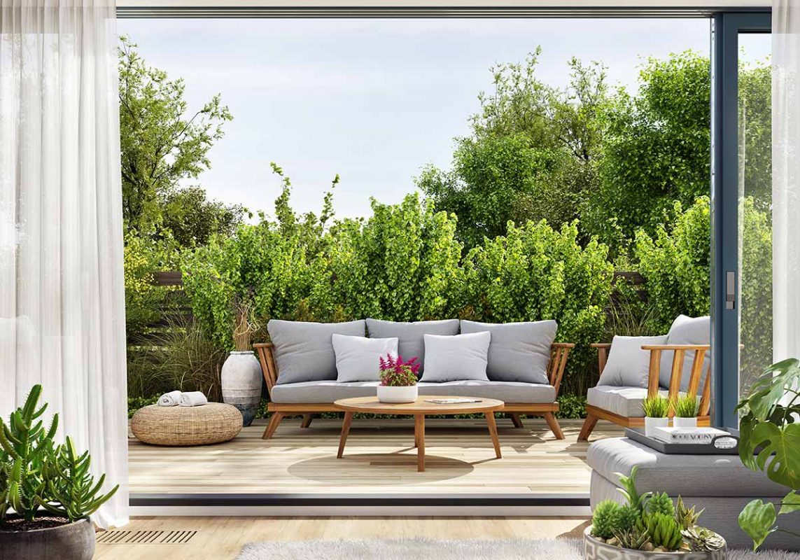 At lægge et flot tæppe på terrassen kan være rigtig hyggeligt og bidrage til den indbydende følelse. Men er det praktisk for netop dig? Træterrasser kan få mærker fra et tæppe, der er blevet vådt. Hvis du ikke vil bruge tid på at olie og pleje dine møbler, så sats på nemme materialer. Ellers kan det blive et fuldtidsjob at løbe ind og ud for at beskytte stoffet eller møblerne hele aftenen. Gå efter beskyttelse til sofaen eller en god opbevaringsplads til puder og lignende.