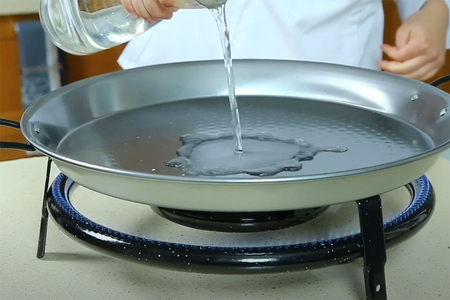 - Fyld paellapanden med vand og lad det absorbere et stykke tid.